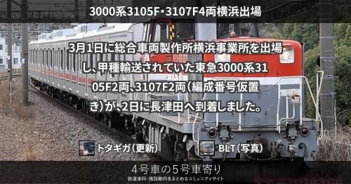 東急 3000系3105F・3107F4両横浜出場 3月1日に総合車両製作所横浜事業所を出場し、甲種輸送されていた東急3000系3105F2両、3107F2両(編成番号仮置き)が、2日に長津田へ到着しました。 https://4gousya.net/forums/post/%e6%9d%b1%e6%80%a53000%e7%b3%bb%e5%a2%97%e7%b5%90%e4%b8%ad%e9%96%93%e8%bb%8a4%e4%b8%a1%e3%81%8cj-trec%e6%a8%aa%e6%b5%9c%e5%87%ba%e5%a0%b4 2022/03/02 2022/03/03 トタギガ 東急