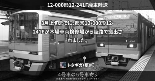 都営 12-000形12-241F廃車陸送 3月上旬までに、都営12-000形12-241Fが木場車両検修場から陸路で搬出されました。 https://4gousya.net/forums/post/%e9%83%bd%e5%96%b612-241f%e9%99%b8%e9%80%81%e9%96%8b%e5%a7%8b 2022/03/13 トタギガ 都営