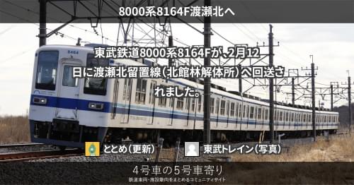 東武 8000系8164F渡瀬北へ 東武鉄道8000系8164Fが、2月12日に渡瀬北留置線(北館林解体所)へ回送されました。 https://4gousya.net/forums/post/%e6%9d%b1%e6%ad%a68164f%e3%81%8c%e5%8c%97%e9%a4%a8%e6%9e%97%e3%81%b8%e8%87%a8%e6%99%82%e5%9b%9e%e9%80%81 2026/02/14 ととめ 東武