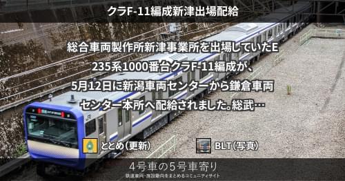 E235系 クラF-11編成新津出場配給 総合車両製作所新津事業所を出場していたE235系1000番台クラF-11編成が、5月12日に新潟車両センターから鎌倉車両センター本所へ配給されました。 総武快速・横須賀線向け1000番台の基本編成11本目で、11号車の電連が省略されました。尾灯は通常仕様です。 2021/05/12 ととめ E235系