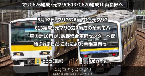 209系 マリC626編成・元マリC613・C620編成10両長野へ 5月12日、マリC626編成と、元マリC613編成・元マリC620編成の余剰モハ車の計10両が、長野総合車両センターへ配給されました。 これにより、幕張車両センターに配置されている209系余剰モハ車全てが長野総合車両センターへと配給されたことになります。 2021/05/12 ととめ 209系