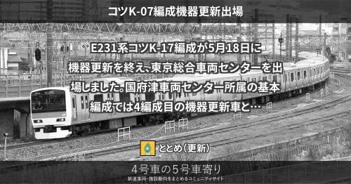 E231系 コツK-07編成機器更新出場 E231系コツK-17編成が5月18日に機器更新を終え、東京総合車両センターを出場しました。 国府津車両センター所属の基本編成では4編成目の機器更新車となります。 2021/05/18 ととめ E231系