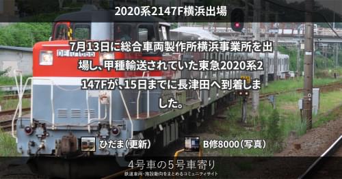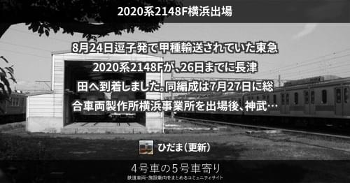 東急 2020系2148F横浜出場 8月24日逗子発で甲種輸送されていた東急2020系2148Fが、26日までに長津田へ到着しました。 同編成は7月27日に総合車両製作所横浜事業所を出場後、神武寺で留置されていました。 https://4gousya.net/forums/post/%e6%9d%b1%e6%80%a52148f%e3%81%8c%e7%a5%9e%e6%ad%a6%e5%af%ba%e3%83%bb%e9%80%97%e5%ad%90%e3%81%8b%e3%82%89%e7%94%b2%e7%a8%ae%e8%bc%b8%e9%80%81 2021/08/26 ひだま 東急