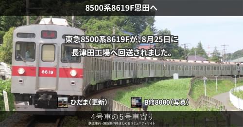 東急 8500系8619F恩田へ 東急8500系8619Fが、8月25日に長津田工場へ回送されました。 https://4gousya.net/forums/post/%e6%9d%b1%e6%80%a58619f-%e5%bb%83%e8%bb%8a%e5%9b%9e%e9%80%81 2021/08/25 ひだま 東急