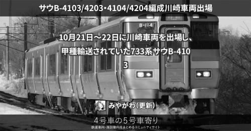 10月21日~22日に川崎車両を出場し、甲種輸送されていた733系サウB-4103/4203編成6両とサウB-4104/4204編成6両の計12両が、24日に札幌運転所に到着しました。
