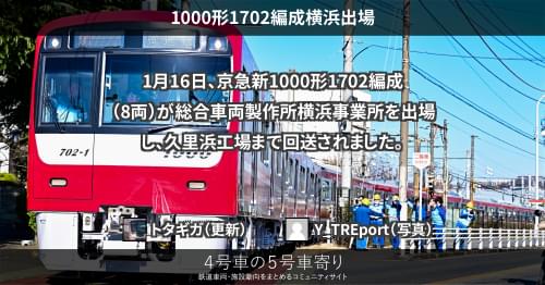 京急 1000形1702編成横浜出場 1月16日、京急新1000形1702編成(8両)が総合車両製作所横浜事業所を出場し、久里浜工場まで回送されました。 https://4gousya.net/forums/post/%e4%ba%ac%e6%80%a51702%e7%b7%a8%e6%88%90%e3%81%8cj-trec%e6%a8%aa%e6%b5%9c%e5%87%ba%e5%a0%b4 2026/01/17 トタギガ 京急