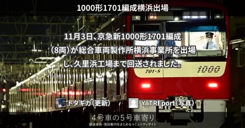 京急 1000形1701編成横浜出場 11月3日、京急新1000形1701編成(8両)が総合車両製作所横浜事業所を出場し、久里浜工場まで回送されました。 https://4gousya.net/forums/post/%e4%ba%ac%e6%80%a5%e6%96%b01000%e5%bd%a21701%e7%b7%a8%e6%88%90j-trec%e6%a8%aa%e6%b5%9c%e5%87%ba%e5%a0%b4 2023/11/03 2023/11/05 トタギガ 京急