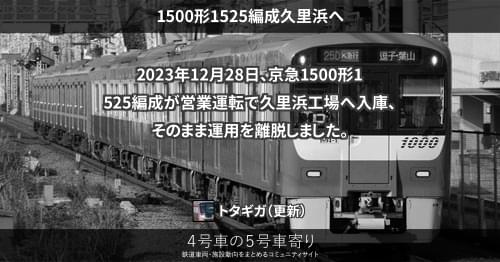 京急 1500形1525編成久里浜へ 2023年12月28日、京急1500形1525編成が営業運転で久里浜工場へ入庫、そのまま運用を離脱しました。 https://4gousya.net/forums/post/%e4%ba%ac%e6%80%a51525%e7%b7%a8%e6%88%90%e3%81%ae%e9%83%a8%e5%93%81%e6%92%a4%e5%8e%bb%e3%81%8c%e9%96%8b%e5%a7%8b 2024年1月16日に部品撤去が確認されたため、廃車として扱います。 2024/01/29 トタギガ 京急
