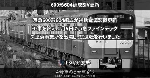 京急 600形604編成SIV更新 京急600形604編成が補助電源装置更新工事を終え、2月5日に京急ファインテック久里浜事業所を出場し、試運転を行いました。 https://4gousya.net/forums/post/%e4%ba%ac%e6%80%a5604%e7%b7%a8%e6%88%90%e3%81%ae%e8%a3%9c%e5%8a%a9%e9%9b%bb%e6%ba%90%e8%a3%85%e7%bd%ae%e3%81%8c%e6%9b%b4%e6%96%b0 2024/02/19 2024/09/27 トタギガ 京急