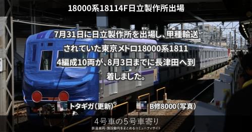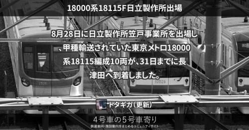 8月28日に日立製作所笠戸事業所を出場し、甲種輸送されていた東京メトロ18000系18115編成10両が、31日までに長津田へ到着しました。