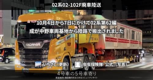 メトロ 02系02-104F廃車陸送 8月23日から26日にかけて02系第104編成が中野車両基地から陸路で搬出されました。 https://4gousya.net/forums/post/%e6%9d%b1%e4%ba%ac%e3%83%a1%e3%83%88%e3%83%ad02-104f%e3%81%8c%e6%90%ac%e5%87%ba%e3%81%95%e3%82%8c%e3%82%8b%ef%bc%88%e5%b7%9d%e9%87%8d%e8%a3%bd%e6%b6%88%e6%bb%85%ef%bc%89 廃車として扱います。 2023/08/26 2023/08/27 トタギガ メトロ