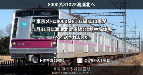 メトロ 8000系8102F渡瀬北へ 東京メトロ8000系8102編成10両が、1月31日に渡瀬北留置線(北館林解体場)へ回送されました。 https://4gousya.net/forums/post/%e6%9d%b1%e4%ba%ac%e3%83%a1%e3%83%88%e3%83%ad8102f%e3%81%8c%e5%8c%97%e9%a4%a8%e6%9e%97%e3%81%b8%e5%9b%9e%e9%80%81%e3%81%95%e3%82%8c%e3%82%8b 廃車として扱います。 2023/01/31 2023/02/01 トタギガ メトロ