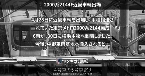 メトロ 2000系2144F近畿車輛出場 4月28日に近畿車輛を出場し、甲種輸送されていた東京メトロ2000系2144編成6両が、30日に横浜本牧へ到着しました。 今後、中野車両基地へ搬入されるとみられます。 https://4gousya.net/forums/post/%e6%9d%b1%e4%ba%ac%e3%83%a1%e3%83%88%e3%83%ad2144f%e7%94%b2%e7%a8%ae%e8%bc%b8%e9%80%81 2023/04/30 トタギガ メトロ