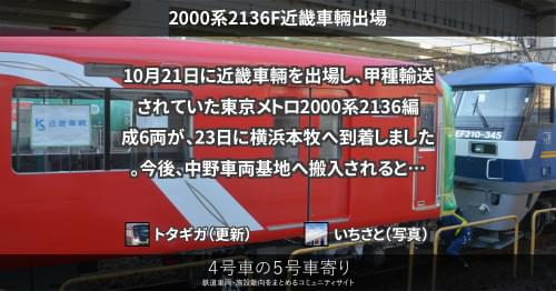 メトロ 2000系2136F近畿車輛出場 10月21日に近畿車輛を出場し、甲種輸送されていた東京メトロ2000系2136編成6両が、23日に横浜本牧へ到着しました。 今後、中野車両基地へ搬入されるとみられます。 https://4gousya.net/forums/post/%e6%9d%b1%e4%ba%ac%e3%83%a1%e3%83%88%e3%83%ad2136f%e3%81%8c%e8%bf%91%e8%bb%8a%e3%82%92%e5%87%ba%e5%a0%b4 2022/10/23 トタギガ メトロ
