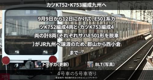 9月9日から12日にかけて、E501系カツK752編成4両と・カツK753編成4両の計8両(それぞれサハE501形を脱車)がJR九州へ譲渡のため、郡山から西小倉まで輸送されました。