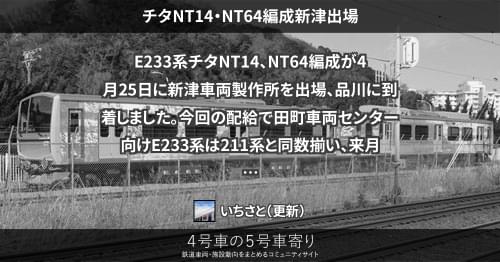 JRの車両その他(東) チタNT14・NT64編成新津出場 E233系チタNT14、NT64編成が4月25日に新津車両製作所を出場、品川に到着しました。 今回の配給で田町車両センター向けE233系は211系と同数揃い、来月からは高崎車両センター向けが出場する予定です。 2012/04/25 いちさと JRの車両その他(東)