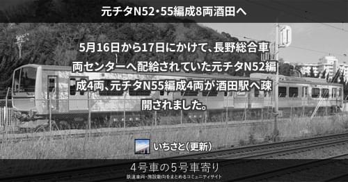JRの車両その他(東) 元チタN52・55編成8両酒田へ 5月16日から17日にかけて、長野総合車両センターへ配給されていた元チタN52編成4両、元チタN55編成4両が酒田駅へ疎開されました。 2012/05/24 いちさと JRの車両その他(東)