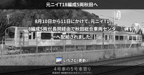 JRの車両その他(東) 元ニイT18編成5両秋田へ 8月10日から11日にかけて、元ニイT18編成5両が長岡経由で秋田総合車両センターへ配給されました。 2015/08/10 2015/08/11 いちさと JRの車両その他(東)