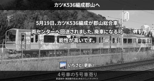 JRの車両その他(東) カツK533編成郡山へ 6月23日、カツK533編成が郡山総合車両センターへ回送されました。6月末から解体されています。 2015/06/23 2015/07/04 いちさと JRの車両その他(東)