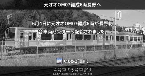 JRの車両その他(東) 元オオOM07編成4両長野へ 5月25日に元オオOM07編成4両が長野総合車両センターへ配給されました。残る6両の動向は不明です。 2015/05/25 いちさと JRの車両その他(東)