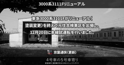 東急3000系3111Fがリニューアル(塗装変更)を終えて元住吉検車区を出場し、12月20日に本線試運転を行いました。