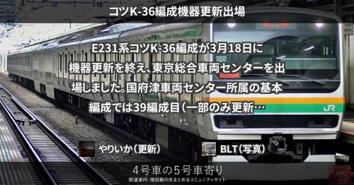 E231系 コツK-36編成機器更新出場 E231系コツK-36編成が3月18日に機器更新を終え、東京総合車両センターを出場しました。 国府津車両センター所属の基本編成では39編成目(一部のみ更新された編成を除く)の機器更新車となります。 https://4gousya.net/forums/post/%e3%82%b3%e3%83%84k-36%e7%b7%a8%e6%88%90%e3%81%8c%e6%9d%b1%e4%ba%ac%e5%87%ba%e5%a0%b4 2025/03/18 やりいか E231系
