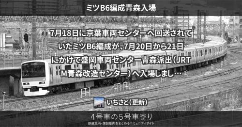 E231系 ミツB6編成青森入場 7月18日に京葉車両センターへ回送されていたミツB6編成が、7月20日から21日にかけて盛岡車両センター青森派出(JRTM青森改造センター)へ入場しました。 2017/07/21 2017/07/22 いちさと E231系