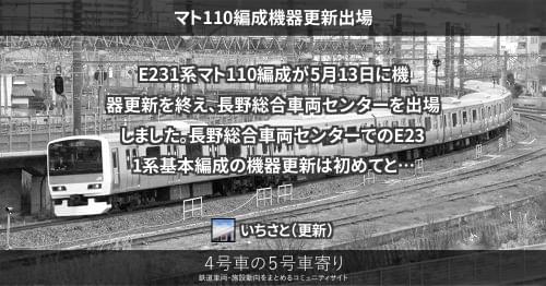 E231系 マト110編成機器更新出場 E231系マト110編成が5月13日に機器更新を終え、長野総合車両センターを出場しました。 長野総合車両センターでのE231系基本編成の機器更新は初めてとなります。 2017/05/13 いちさと E231系