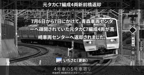 211系(東) 元タカC7編成4両新前橋返却 7月6日から7日にかけて、青森車両センターへ疎開されていた元タカC7編成4両が高崎車両センターへ返却されました。 2016/07/06 2016/08/04 いちさと 211系(東)