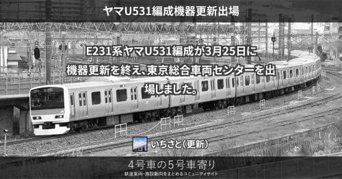 E231系 ヤマU510編成機器更新出場 E231系ヤマU510編成が4月28日に機器更新を終え、大宮総合車両センターを出場しました。 大宮総合車両センターでのE231系基本編成の機器更新は初めてとなります。 2016/04/28 2016/05/01 いちさと E231系