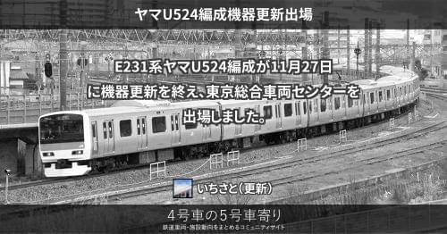 E231系 ヤマU524編成機器更新出場 E231系ヤマU524編成が11月27日に機器更新を終え、東京総合車両センターを出場しました。 2015/11/27 2015/12/08 いちさと E231系
