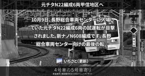 211系(東) 元チタN22編成6両甲信地区へ 10月9日、長野総合車両センターに入場していた元チタN22編成6両の試運転が目撃されました。新ナノN608編成です。 長野総合車両センター向けの最後の転用車となるでしょう。東京総合車両センター所属の211系は消滅しました。 2015/10/09 2015/10/10 いちさと 211系(東)
