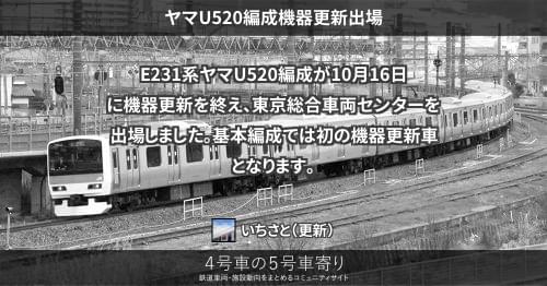 E231系 ヤマU520編成機器更新出場 E231系ヤマU520編成が10月16日に機器更新を終え、東京総合車両センターを出場しました。 基本編成では初の機器更新車となります。 2015/10/16 いちさと E231系