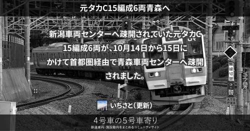 211系(東) 元タカC15編成6両青森へ 新潟車両センターへ疎開されていた元タカC15編成6両が、10月14日から15日にかけて首都圏経由で青森車両センターへ疎開されました。 2015/10/14 2015/10/17 いちさと 211系(東)