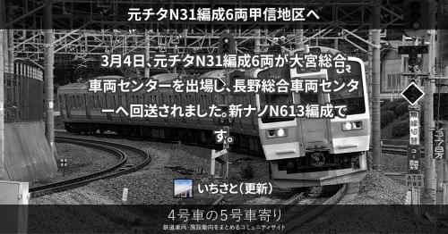 211系(東) 元チタN31編成6両甲信地区へ 3月4日、元チタN31編成6両が大宮総合車両センターを出場し、長野総合車両センターへ回送されました。新ナノN613編成です。 2015/03/04 いちさと 211系(東)