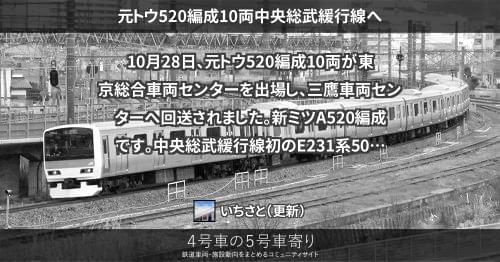 E231系 元トウ520編成10両中央総武緩行線へ 10月28日、元トウ520編成10両が東京総合車両センターを出場し、三鷹車両センターへ回送されました。新ミツA520編成です。 中央総武緩行線初のE231系500番代の配置となります。新コンテンツとして「山手線・中央総武緩行線の世代交代」を公開しました。 2014/10/28 いちさと E231系
