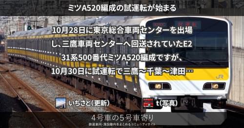 E231系 ミツA520編成の試運転が始まる 10月28日に東京総合車両センターを出場し、三鷹車両センターへ回送されていたE231系500番代ミツA520編成ですが、10月30日に試運転で三鷹~千葉~津田沼を走行しました。 VISの動作確認などが行われていたようで、今後も試運転は続く見込みです。 2014/10/30 いちさと E231系