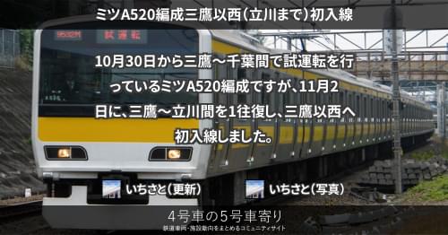 E231系 ミツA520編成三鷹以西(立川まで)初入線 10月30日から三鷹~千葉間で試運転を行っているミツA520編成ですが、11月2日に、三鷹~立川間を1往復し、三鷹以西へ初入線しました。 2014/11/02 いちさと E231系