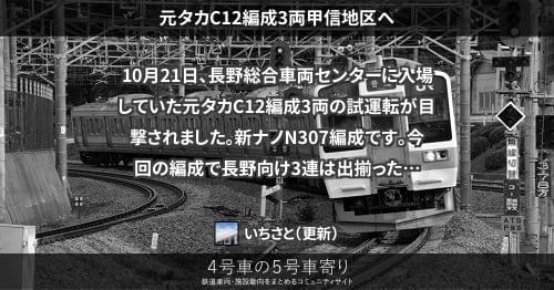 211系(東) 元タカC12編成3両甲信地区へ 10月21日、長野総合車両センターに入場していた元タカC12編成3両の試運転が目撃されました。新ナノN307編成です。 今回の編成で長野向け3連は出揃ったことになります。 2014/10/21 いちさと 211系(東)