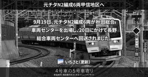 9月24日から25日にかけて、北長野駅へ疎開されていた元チタN6編成6両が、長野総合車両センターから秋田総合車両センターへ入場しました。今回は直江津経由ではなく首都圏経由で配給されました。