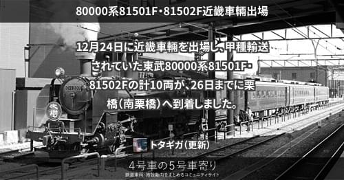 12月24日に近畿車輛を出場し、甲種輸送されていた東武80000系81501F・81502Fの計10両が、26日までに栗橋(南栗橋)へ到着しました。