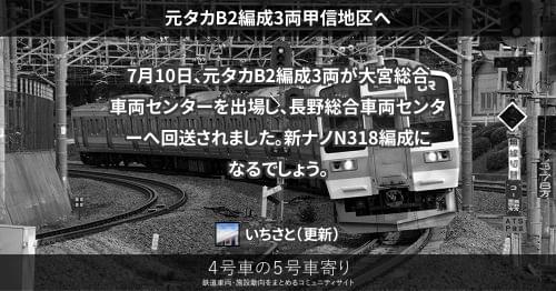 211系(東) 元タカB2編成3両甲信地区へ 7月10日、元タカB2編成3両が大宮総合車両センターを出場し、長野総合車両センターへ回送されました。新ナノN318編成になるでしょう。 2014/07/10 いちさと 211系(東)