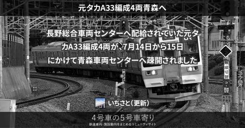 211系(東) 元タカA33編成4両青森へ 長野総合車両センターへ配給されていた元タカA33編成4両が、7月14日から15日にかけて青森車両センターへ疎開されました。 2014/07/14 いちさと 211系(東)