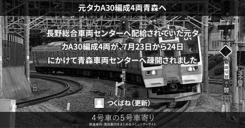 211系(東) 元タカA30編成4両青森へ 長野総合車両センターへ配給されていた元タカA30編成4両が、7月23日から24日にかけて青森車両センターへ疎開されました。 2014/07/23 つくばね 211系(東)