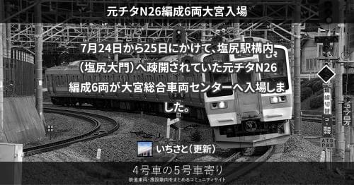 211系(東) 元チタN26編成6両大宮入場 7月24日から25日にかけて、塩尻駅構内(塩尻大門)へ疎開されていた元チタN26編成6両が大宮総合車両センターへ入場しました。 2014/07/24 いちさと 211系(東)