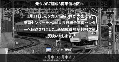 211系(東) 元タカB7編成3両甲信地区へ 3月31日、元タカB7編成3両が大宮総合車両センターを出場し、長野総合車両センターへ回送されました。新編成番号が判明次第、反映いたします。 2014/03/31 いちさと 211系(東)