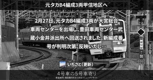 211系(東) 元タカB4編成3両甲信地区へ 2月27日、元タカB4編成3両が大宮総合車両センターを出場し、豊田車両センター武蔵小金井派出所へ回送されました。新編成番号が判明次第、反映いたします。 2014/02/27 いちさと 211系(東)