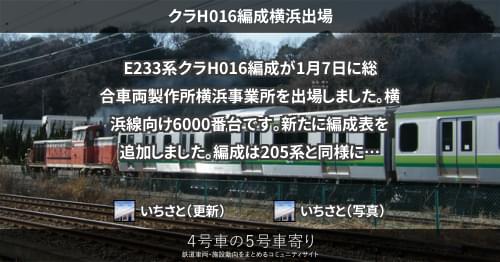 E233系 クラH016編成横浜出場 E233系クラH016編成が1月7日に総合車両製作所横浜事業所を出場しました。横浜線向け6000番台です。 新たに編成表を追加しました。編成は205系と同様に付随車の位置が偏った8連で、既報の通り6ドア車は連結されていません。 2014/01/07 いちさと E233系