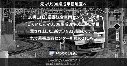 211系(東) 元マリ508編成甲信地区へ 10月11日、長野総合車両センターに入場していた元マリ508編成3両の試運転が目撃されました。新ナノN338編成です。 これで幕張車両センター所属の211系の転用改造は終了となります。 2013/10/11 いちさと 211系(東)