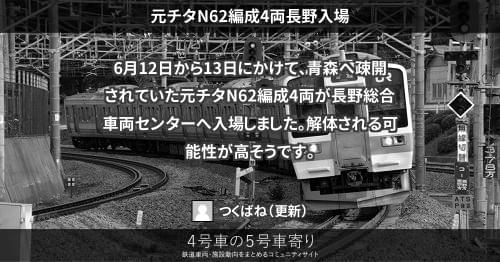 211系(東) 元チタN62編成4両長野入場 6月12日から13日にかけて、青森へ疎開されていた元チタN62編成4両が長野総合車両センターへ入場しました。解体される可能性が高そうです。 2013/06/12 つくばね 211系(東)